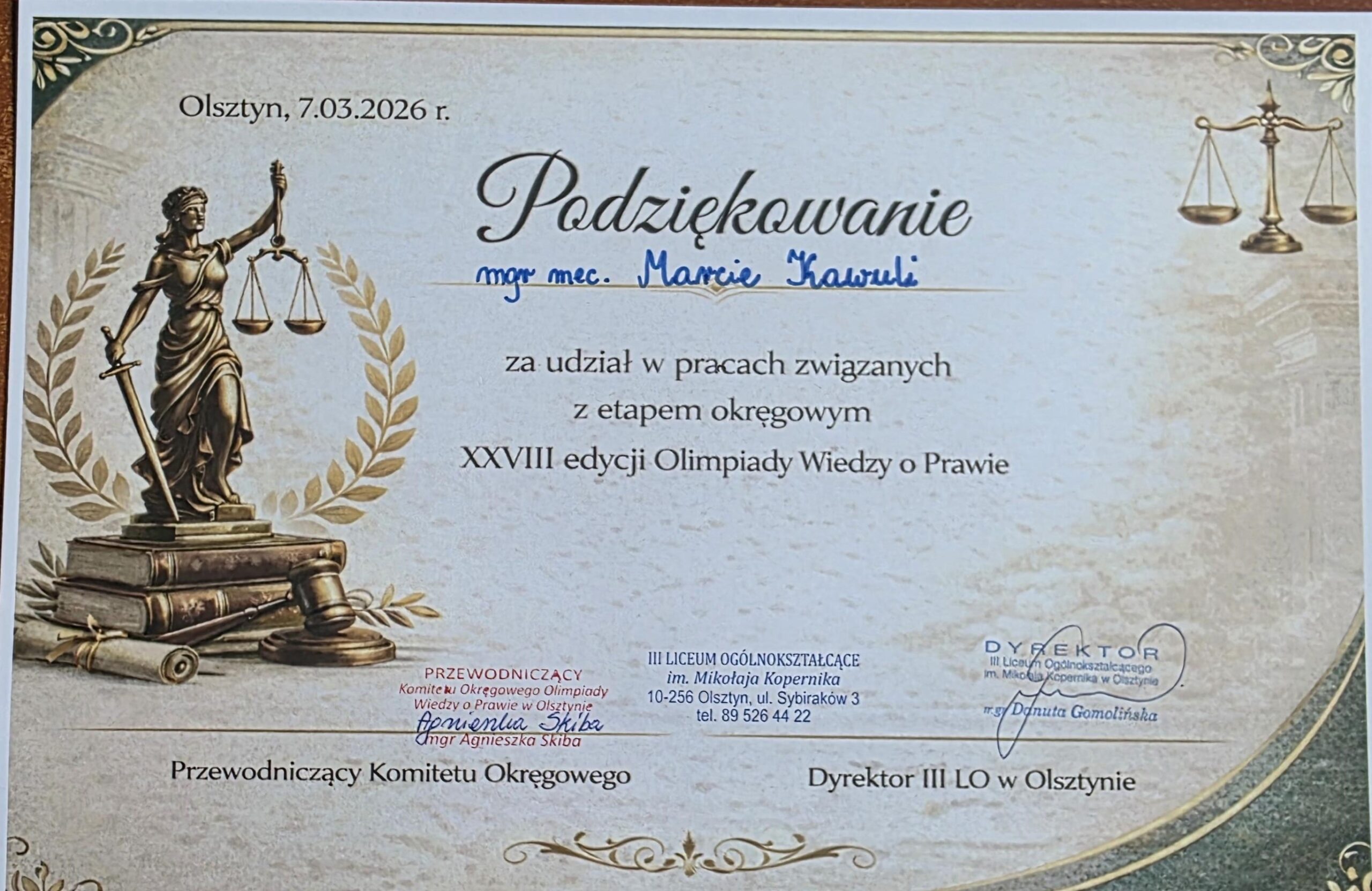 7 marca 2026 r. W III Liceum Ogólnokształcącym w Olsztynie odbył się etap wojewódzki XXVIII edycji Olimpiady Wiedzy o Prawie. Wydarzenie zgromadziło uczniów szkół ponadpodstawowych z regionu, którzy zmierzyli się z wymagającymi zagadnieniami z zakresu prawa oraz wiedzy o państwie.